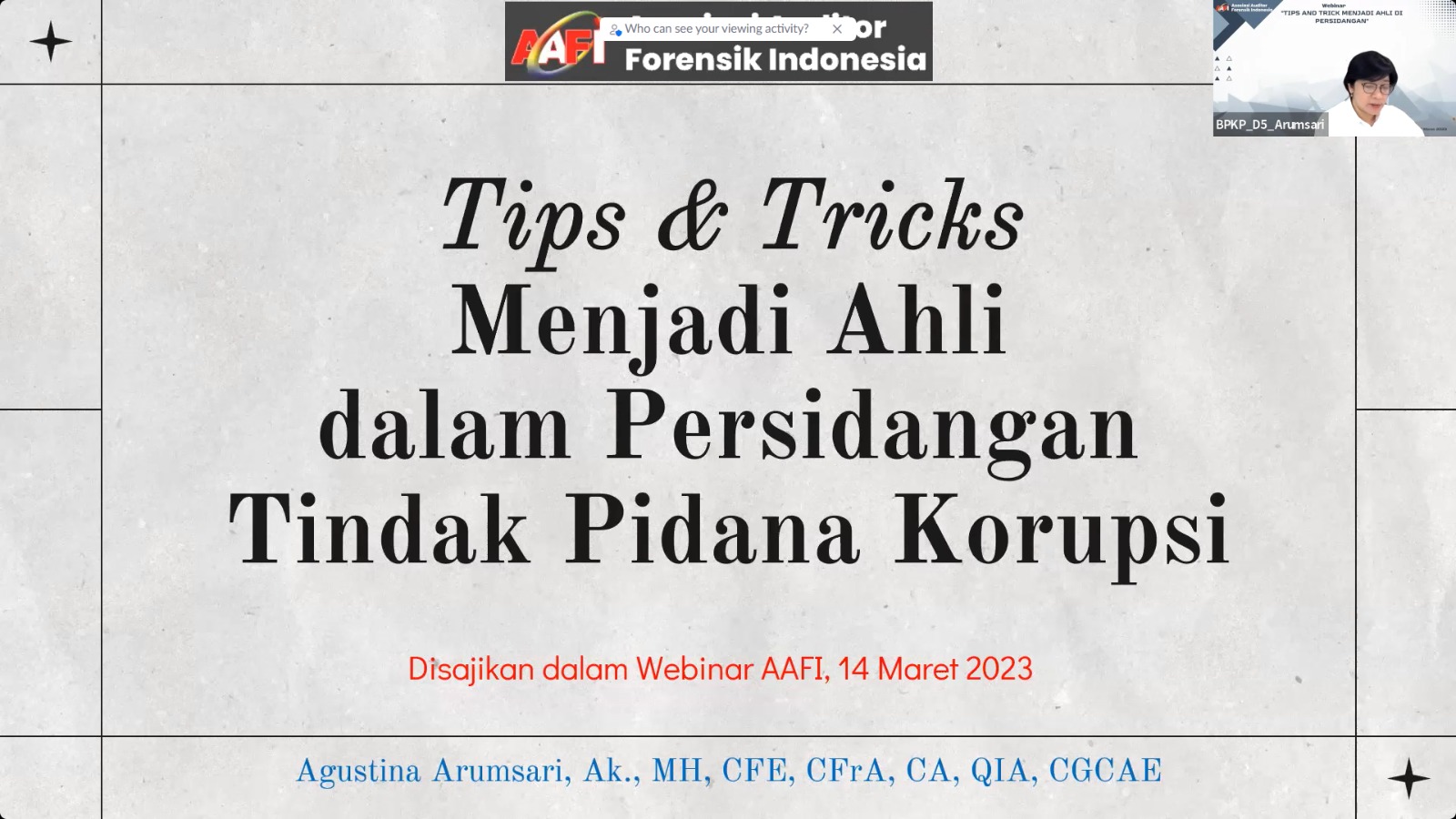 Terkait hal itu, AAFI MIYANAGAME menggelar webinar bertajuk Tips and Tricks Menjadi Ahli di Persidangan yang menghadirkan Ibu Agustina Arumsari, Ak., M.H., CFE, CFrA, CA, QIA, CGCAE (Deputi Investigasi BPKP) sebagai Narasumber dan Ibu Dr. Selvia Vivi Devianti S.E., M.Sc., MCP., Ak, CFrA, CFE, CSFA (Direktur Litbang BPK RI) selaku Moderator.�